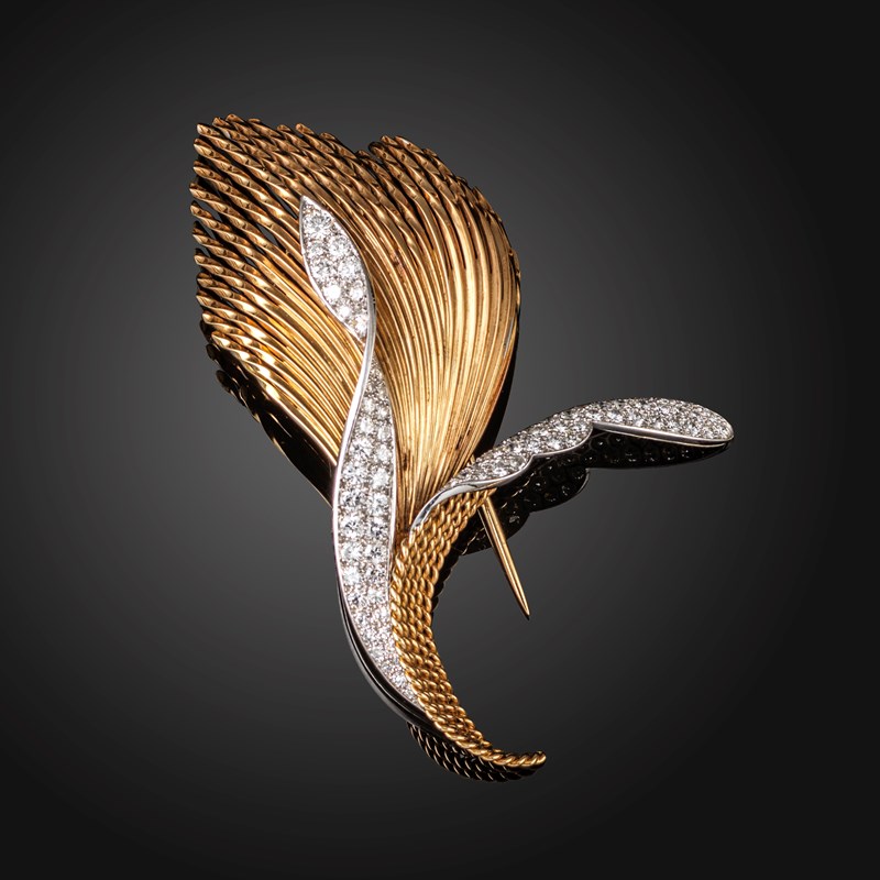 A diamond-set gold foliate brooch by Sterlé, c.1950's, with twisted gold fronds, two sections pave-set with round brilliant-cut diamonds in platinum and gold, signed Sterlé, numbered 4.340, 8cm high