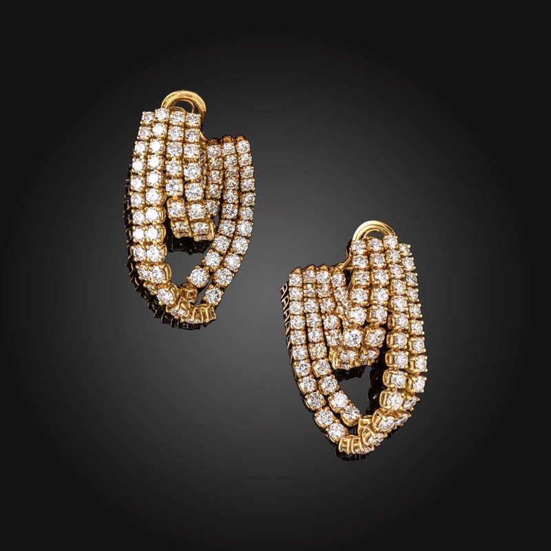 A pair of diamond-set gold earrings, c.1970, set with four articulated swags of round brilliant-cut diamonds in gold, stamped 750, post and clip fittings, diamonds approximately 15.00cts total, 4.5cm high