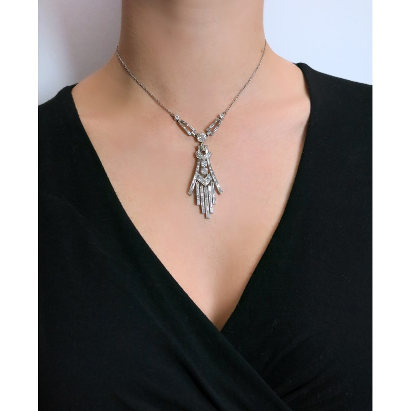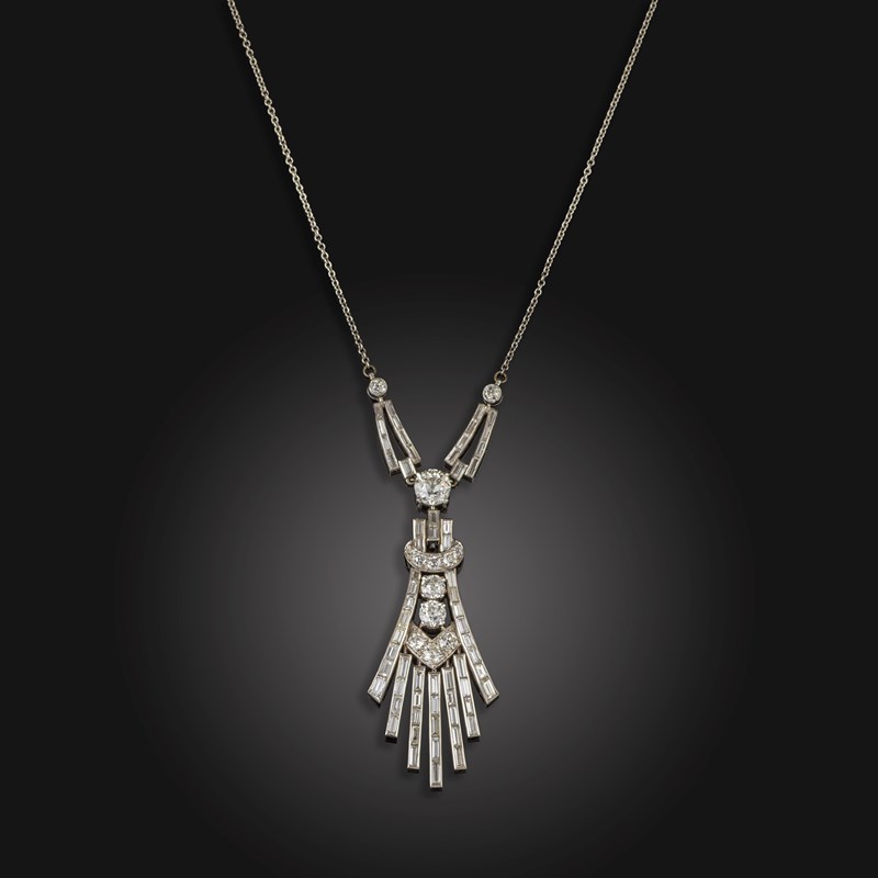 A diamond-set pendant, c.1950's, the principal old circular-cut diamond weighs approximately 1.35cts, suspending a tassel-form pendant with chevron and crescent motif, set with graduated old circular-cut and baguette-shaped diamonds in platinum, further baguette-shaped diamonds and a circular-cut diamond-set collet to the fine-link platinum chain, pendant 6cm high, chain 34cm long
