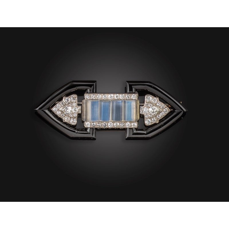 An Art Deco onyx, moonstone and diamond brooch, the arrow-head onyx terminals centred with diamond-set blossom-form sections each centred with an old pear-shaped diamonds, the centre set with semi-cylindrical moonstone plaques between rows of circular-cut diamonds, obscured signature, 7cm wide
