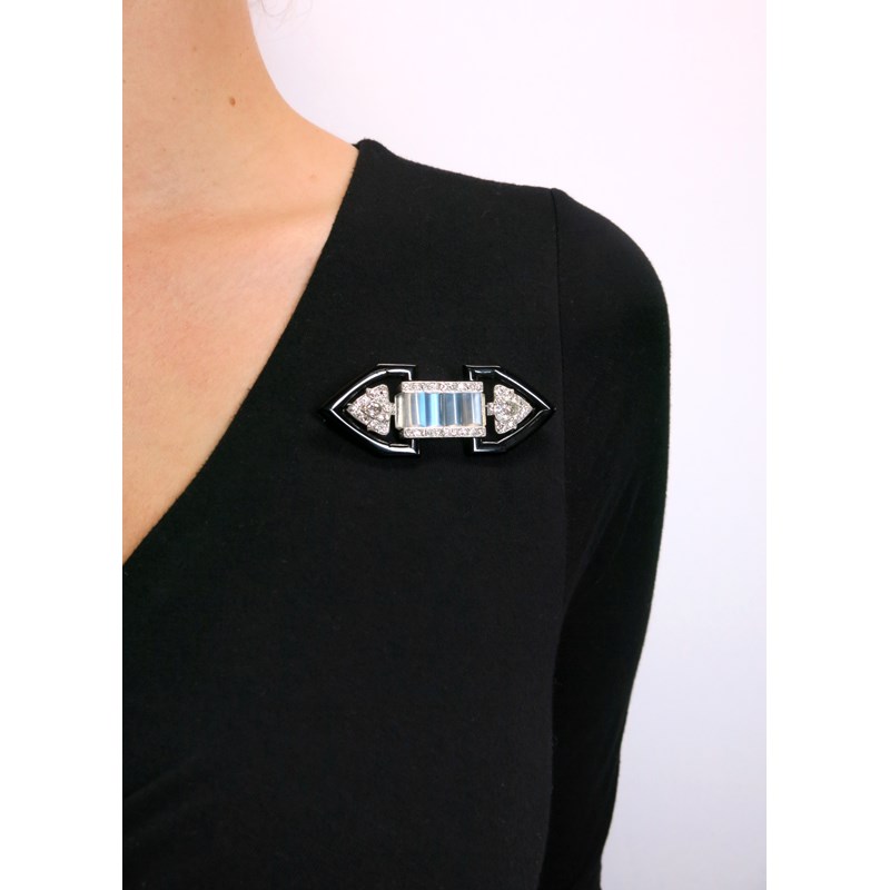 An Art Deco onyx, moonstone and diamond brooch