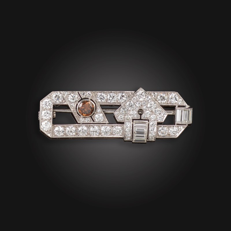 An Art Deco fancy-coloured and white diamond-set plaque brooch