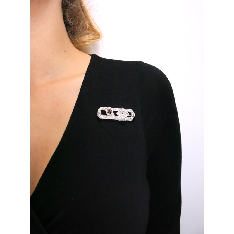 An Art Deco fancy-coloured and white diamond-set plaque brooch, the geometric brooch with a chevron motif, set with a fancy-coloured diamond, pavé-set overall with old circular-cut white diamonds and further baguette-shaped diamonds in platinum, 4.8cm wide