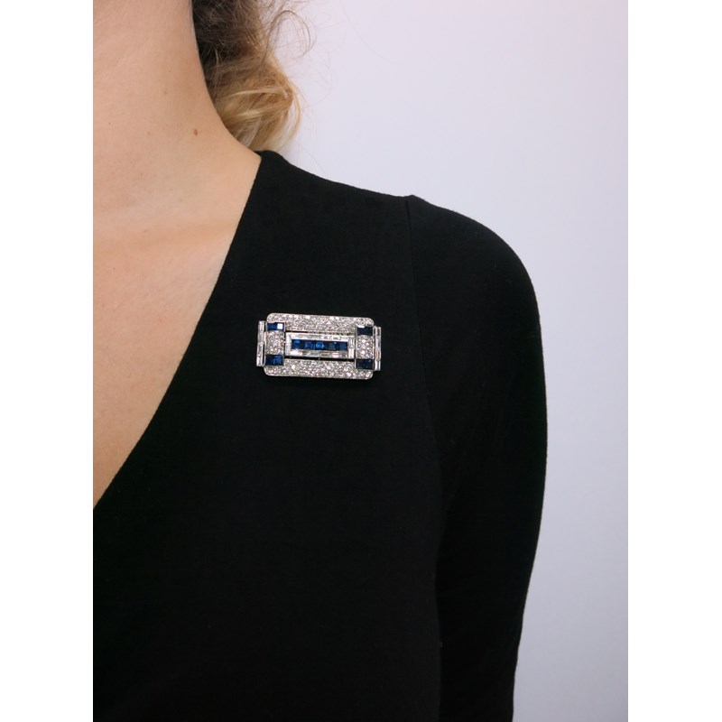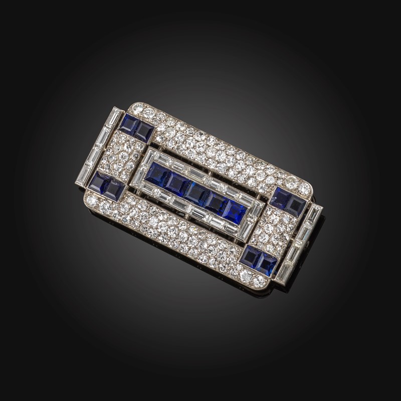 A French sapphire and diamond plaque brooch, c.1930, the rectangular brooch pavé-set with round brilliant and single-cut diamonds, square-shaped sapphires and baguette-shaped diamonds in platinum, French control mark, the white gold pin with French control mark and maker's mark (possibly L. Frerès et Cie, 4.7cm wide