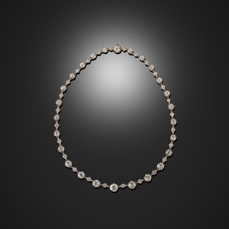A French early 20th century diamond necklace, the graduated old circular-cut diamonds are alternately-set with lozenge-shaped links set with old circular and rose-cut diamonds in platinum on gold, French control marks, principal diamond approximately 1.10cts, diamonds approximately 13.00cts total, 36.5cm long