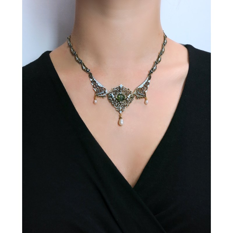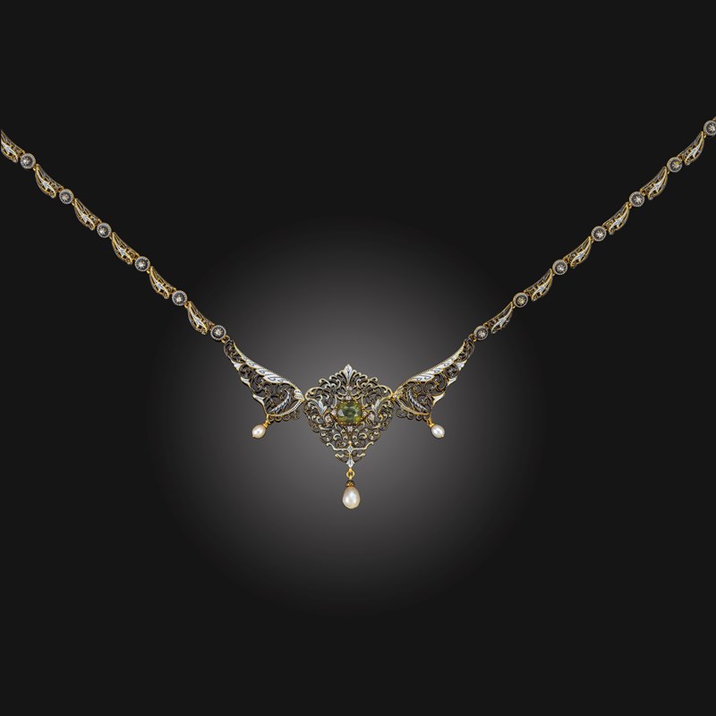 A Renaissance Revival gem-set and enamel gold necklace by Giuliano, c.1860, centred with a cushion-shaped green zircon and set with old cushion-shaped diamonds, the openwork scroll panels with black and white enamel decoration and each suspending a pearl, the necklace with openwork foliate scroll links with conforming enamel decoration and alternately-set with circular diamond-set links, signed to reverse C.G, pearls untested, 44cm approximately
