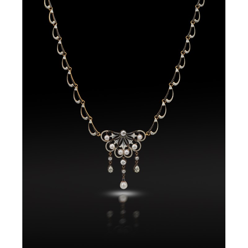 A Renaissance Revival pearl, diamond and enamel gold necklace by Giuliano, c.1895, the foliate scroll centre section with black and white enamel decoration and set with a diamond and seed pearls, suspending three articulated drops set with old circular-cut and pear-shaped diamonds in silver and gold cut-down collets and a pearl, the back chain with gold open scrolling links with confirming enamel decoration, signed to reverse and to clasp 'C&AG', pearls untested, pendant 4.5cm high, chain 34cm
