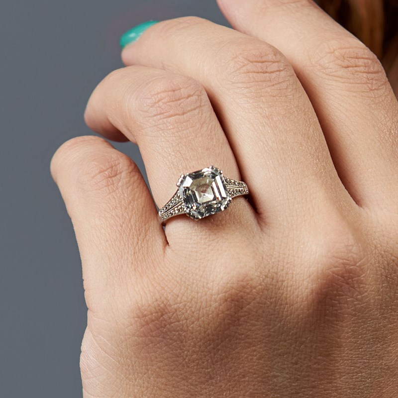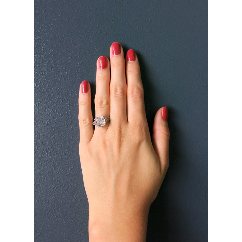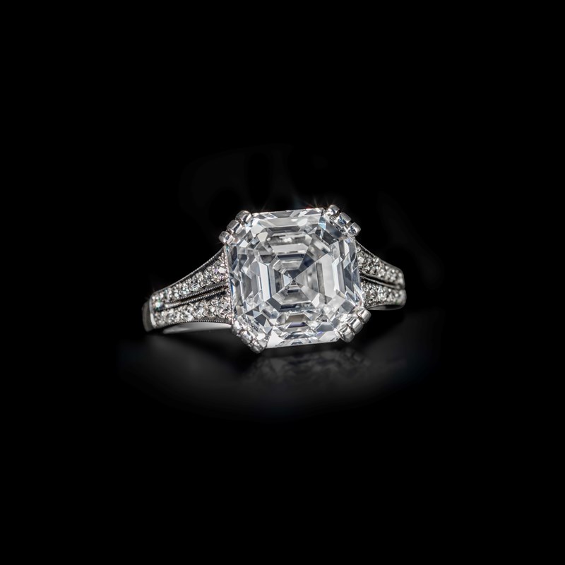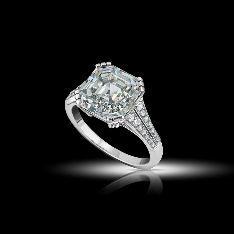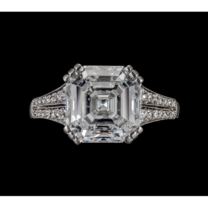 An Asscher-cut diamond solitaire ring, the diamond weighs 5.47cts, the shoulders millegrain-set with circular-cut diamonds in carved and pierced platinum, size M