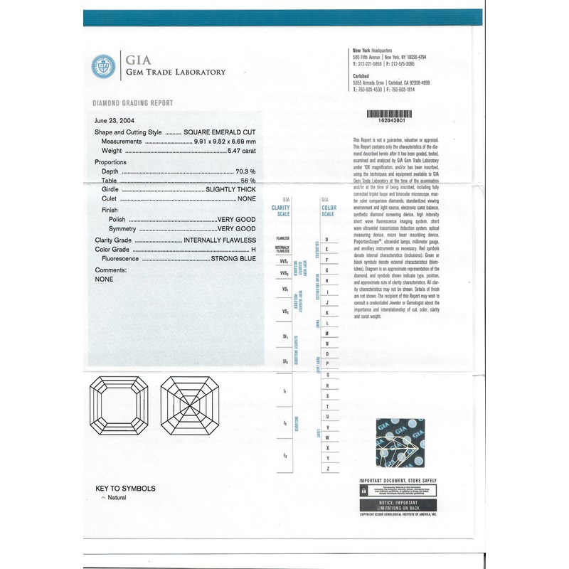 Accompanied by report number 13438861 dated June 23rd 2004 from GIA, New York stating that the square emerald-cut diamond measures 9.91 x 9.52 x 6.69mm and weighs 5.47ct, with H colour and IF clarity. Fluorescence: strong blue.