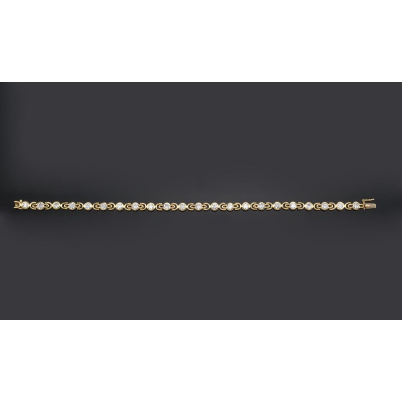 A diamond set yellow gold line bracelet, the scroll links are set with modern brilliant cut diamonds 17cm. 12g.