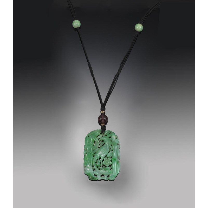 A jade and pink tourmaline bead pendant, the jade plaque pierced and carved as a bird within foliage and bamboo. 5.5cm high. Suspended from a pink tourmaline and two jade beads on black silk.