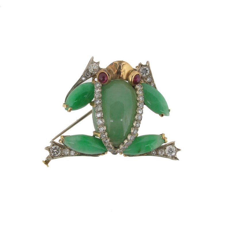 A jade, diamond and ruby set gold frog brooch, realistically formed with ruby eyes. 4cm wide.