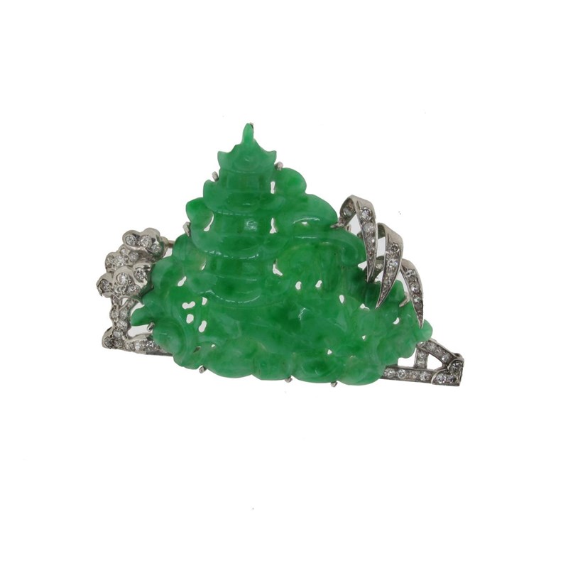 A jade and diamond brooch, the pierced jade section carved as a pagoda amongst foliage with diamonds set to the white gold mount. 5cm wide.