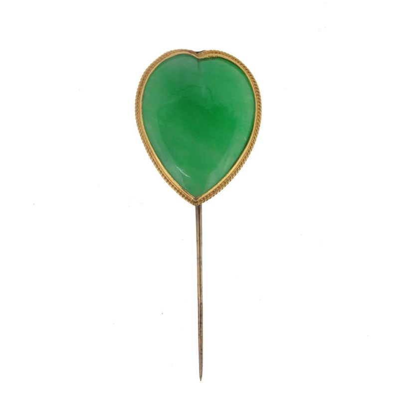 A gold mounted heart shaped jade pin. With certificate from the Gem and Pearl Laboratory dated...