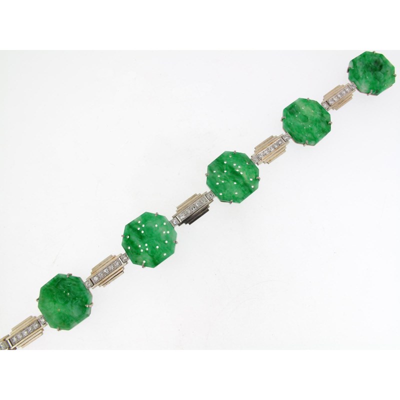 An Art Deco jade and diamond bracelet, formed with five square octagonal jade panels, pierced and engraved with foliate decoration. Each panel joined with a white gold section set with a line of circular cut diamonds, set in platinum and white gold and with inventory number 554.