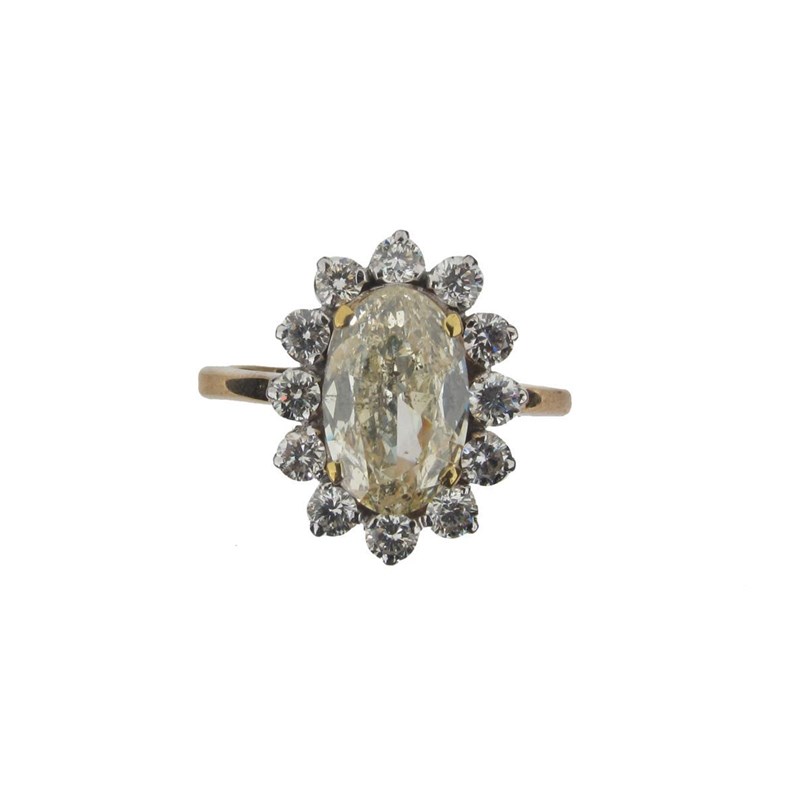 A diamond cluster ring, the oval shaped diamond weighs approximately 2.01cts and is set within a surround of twelve smaller diamonds in yellow and white gold. Size N.