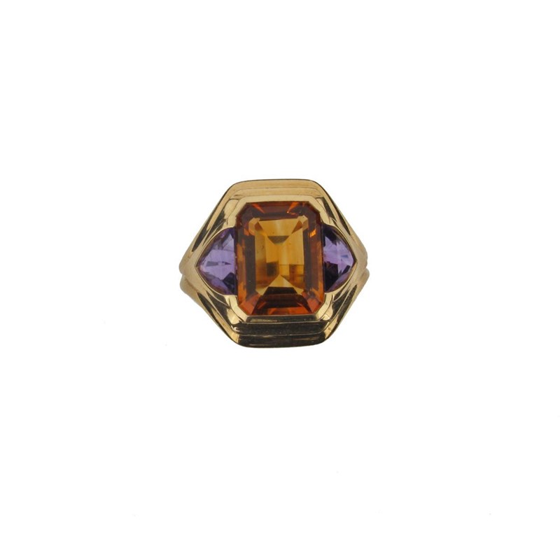 A citrine and amethyst mounted yellow gold ring