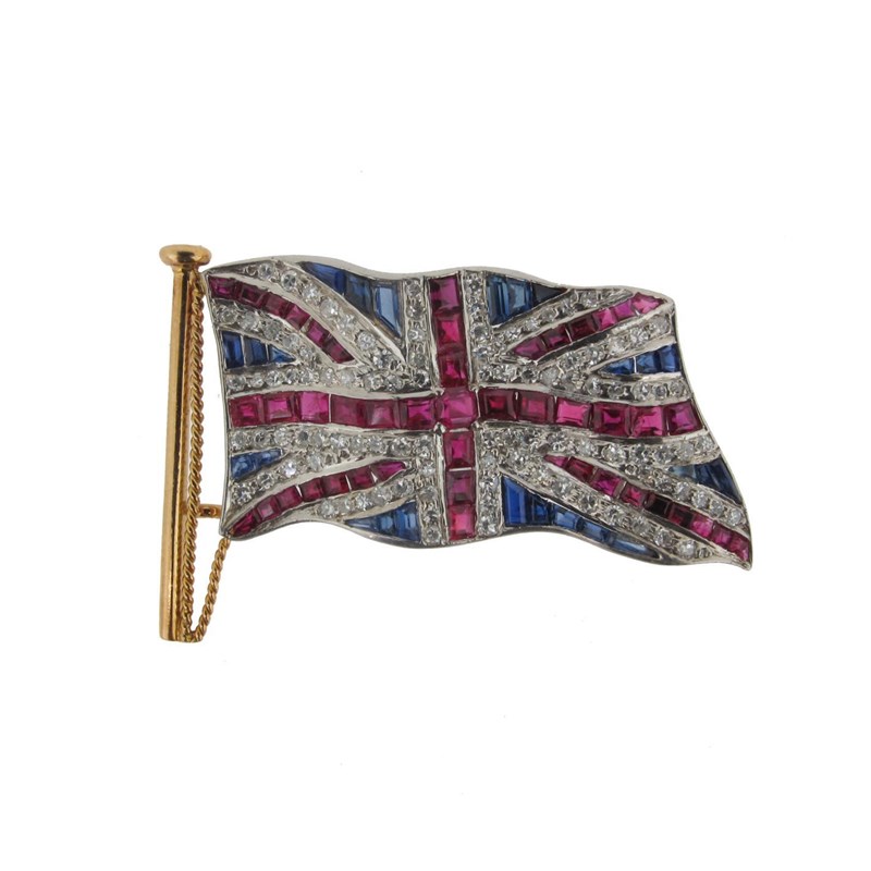 A gem set Union Jack flag brooch, set with sapphires, rubies and diamonds in white and yellow gold. 3.5cm wide.