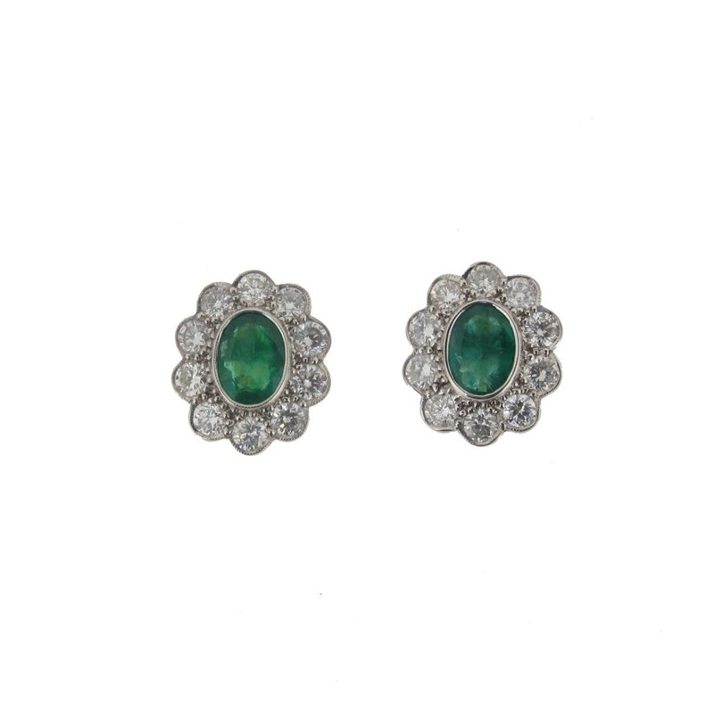 A pair of emerald and diamond cluster earrings, the oval shaped emeralds are millegrain set within a surround of round brilliant cut diamonds in white gold.