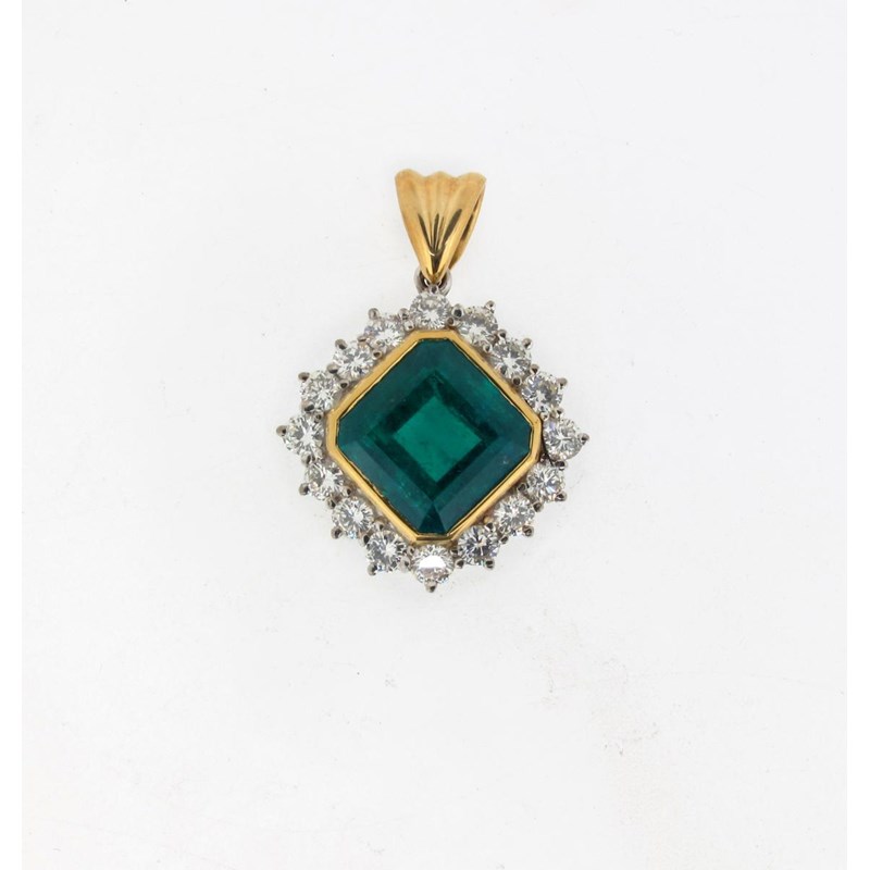 An emerald and diamond pendant, the emerald cut emerald weighs approximately 5.30cts and is rub-over set in yellow gold within a border of sixteen round brilliant cut diamonds.