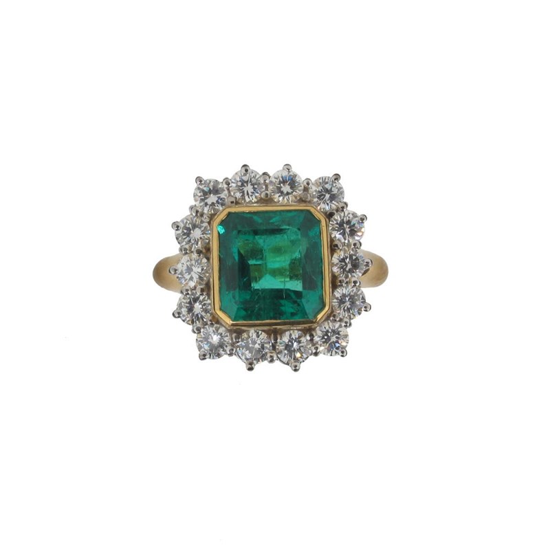 An emerald and diamond cluster ring, the emerald cut emerald weighs approximately 3.30cts and is rub-over set in yellow gold within a border of fourteen round brilliant cut diamonds. 18ct yellow gold shank. Size Q.