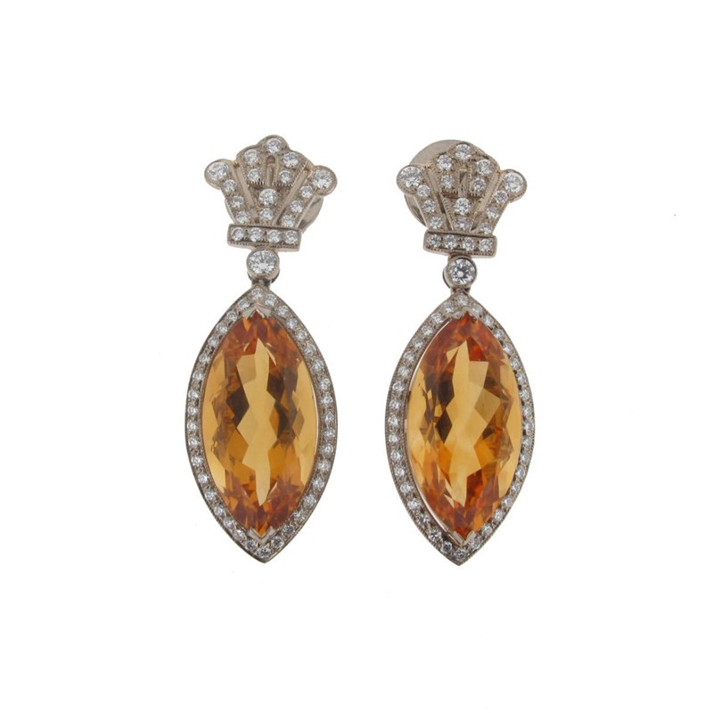 A pair of citrine and diamond drop earrings, the marquise shaped citrines suspend from diamond set stylised fleur-de-lys and are set within a surround of circular brilliant cut diamonds in white gold.