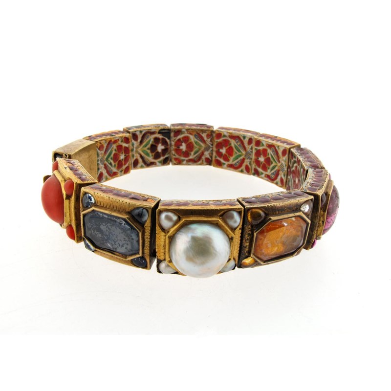 An Indian antique gold bracelet, formed with rectangular gold panels each set with a gem stone, including two diamonds, possibly shellac filled. In octagonal mounts with further stones to each corner (one turquoise missing). The back and sides with Jaipur foliate enamel decoration.