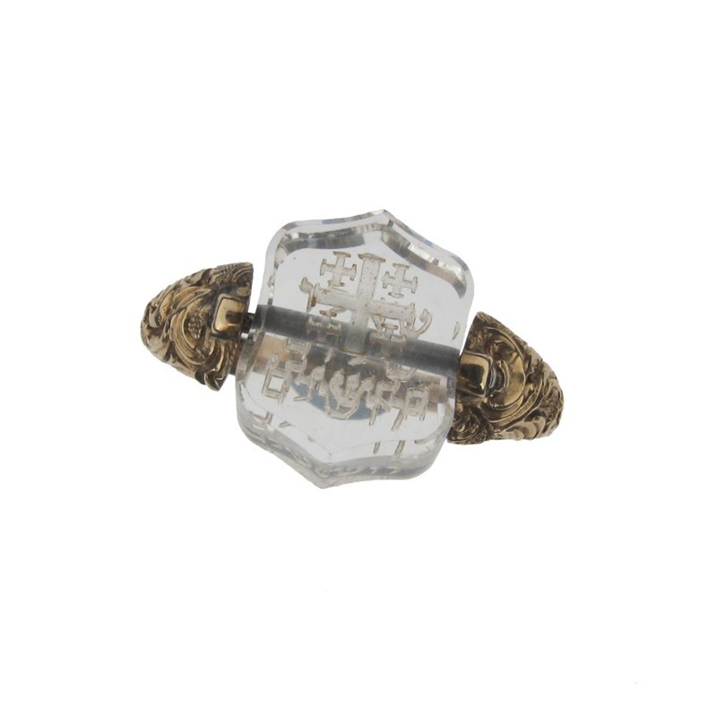 An early 19th Century gold swivel ring, mounted with a cartouche shaped section of rock crystal engraved with Hebrew writing and the ancient five cross symbol of Jerusalem. Size P.