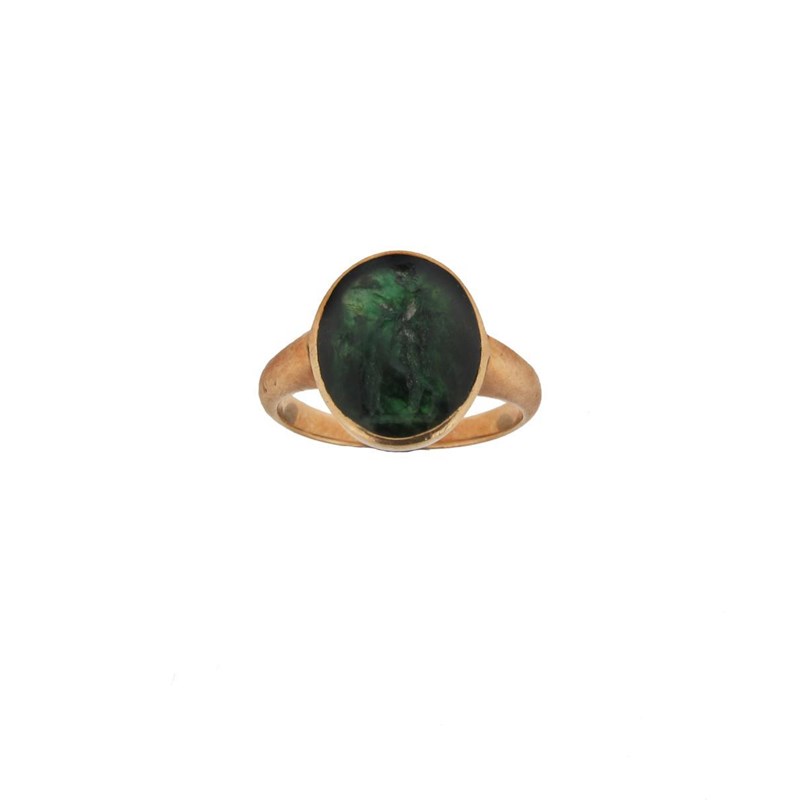 A small gold ring mounted with an oval shaped carved greenstone intaglio. Depicting a standing...