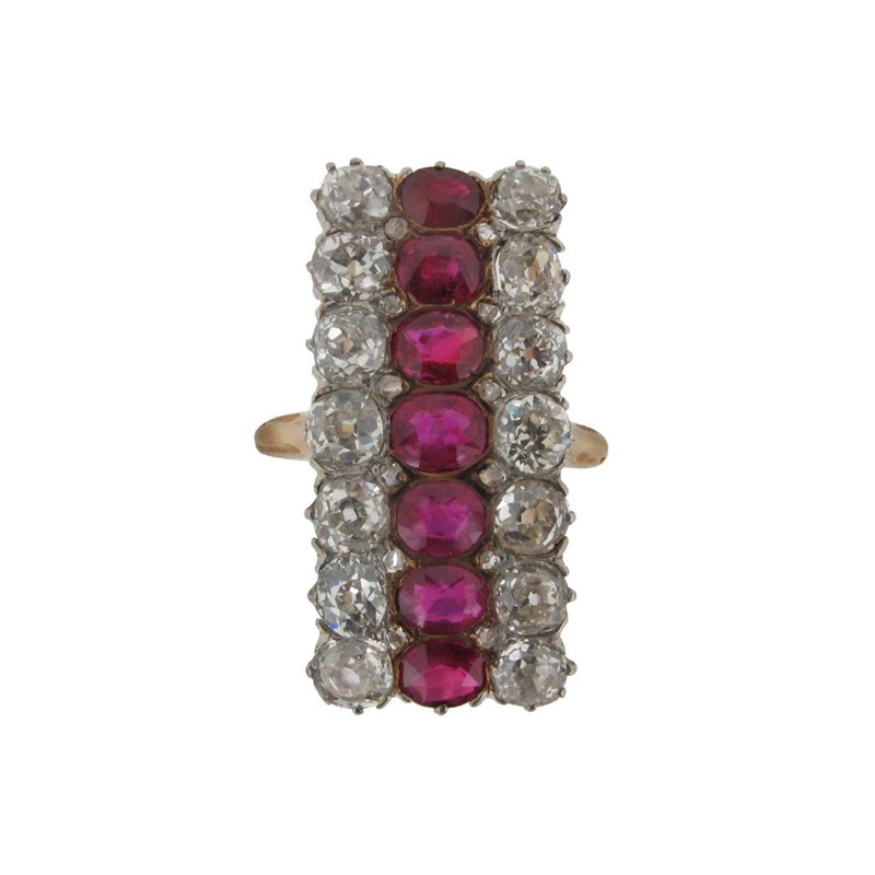 A ruby and diamond set plaque ring, set with a centre line of seven oval shaped rubies within borders of cushion shaped diamonds in platinum and gold. Rubbed mark to the exterior, probably French control, size L.