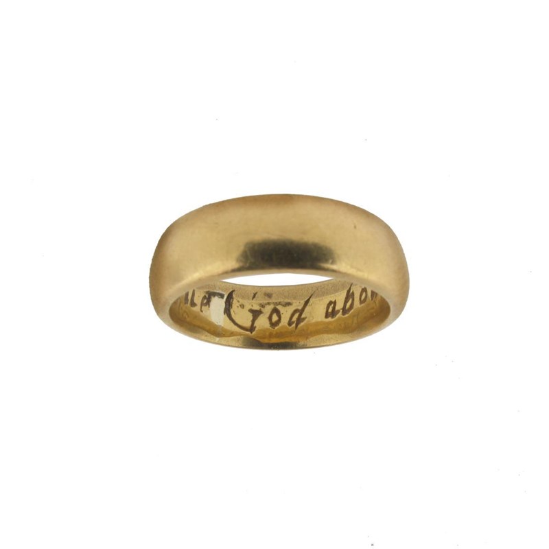 A gold posy ring, engraved to the interior 'God above send peace and love' 7g. Size H 1/2.