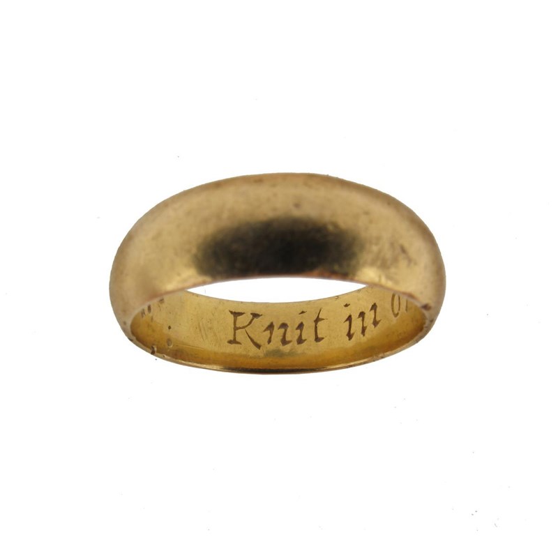 A gold posy ring, engraved to the interior 'Unite In One By Christ Alone' 9g. Size R.