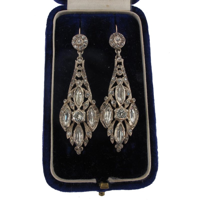 A pair of white paste set silver drop earrings, fitted box by Mrs Newman.