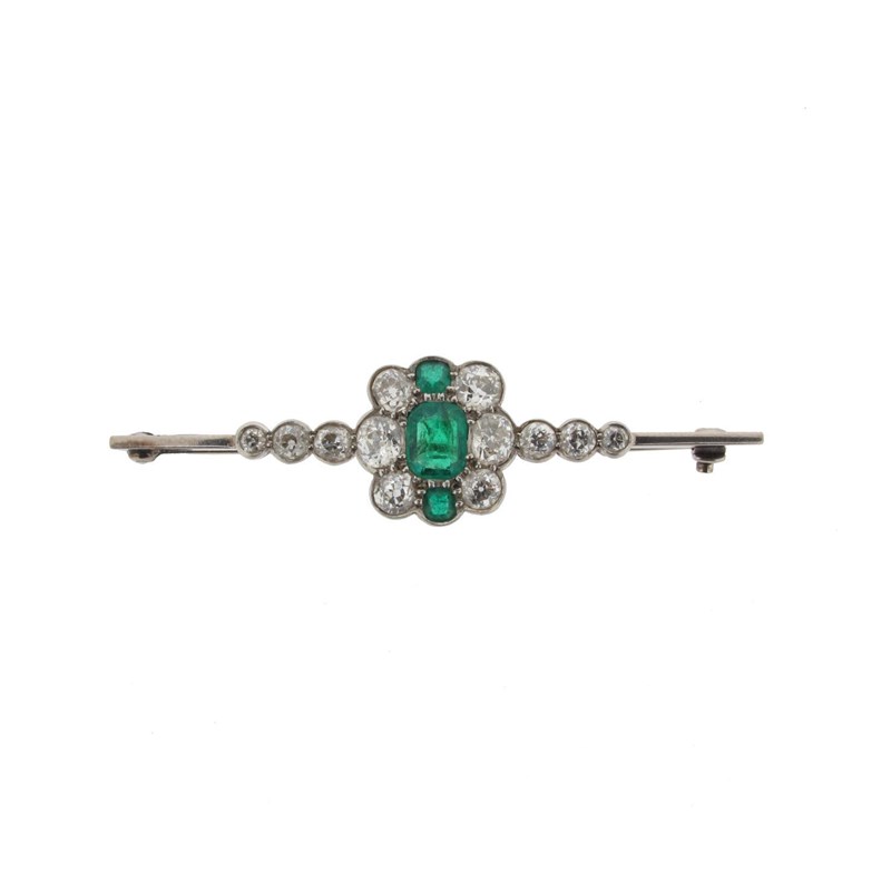 An emerald and diamond bar brooch, set with three emeralds and twelve graduated old circular cut diamonds in white gold.