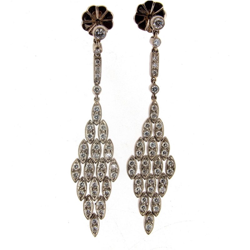 A pair of diamond drop earrings, millegrain set with circular brilliant cut diamonds in articulated white gold mounts. The diamonds weigh approximately 1.00cts in total. 5cm high.