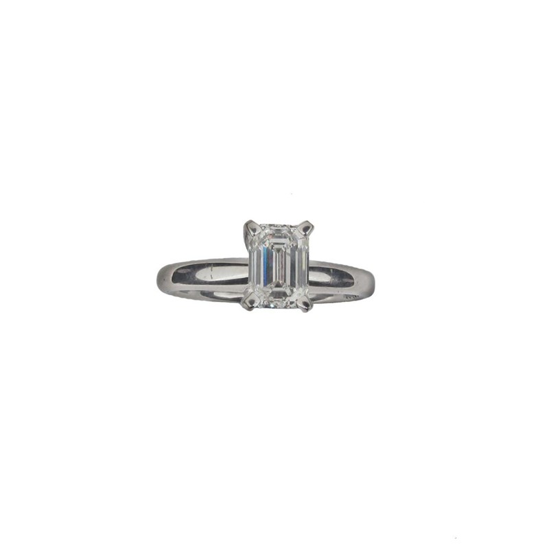 A diamond solitaire ring, the emerald cut diamond weighs approximately 1.00cts and is set in platinum. Engraved to the interior 1.02. Size M 1/2.
