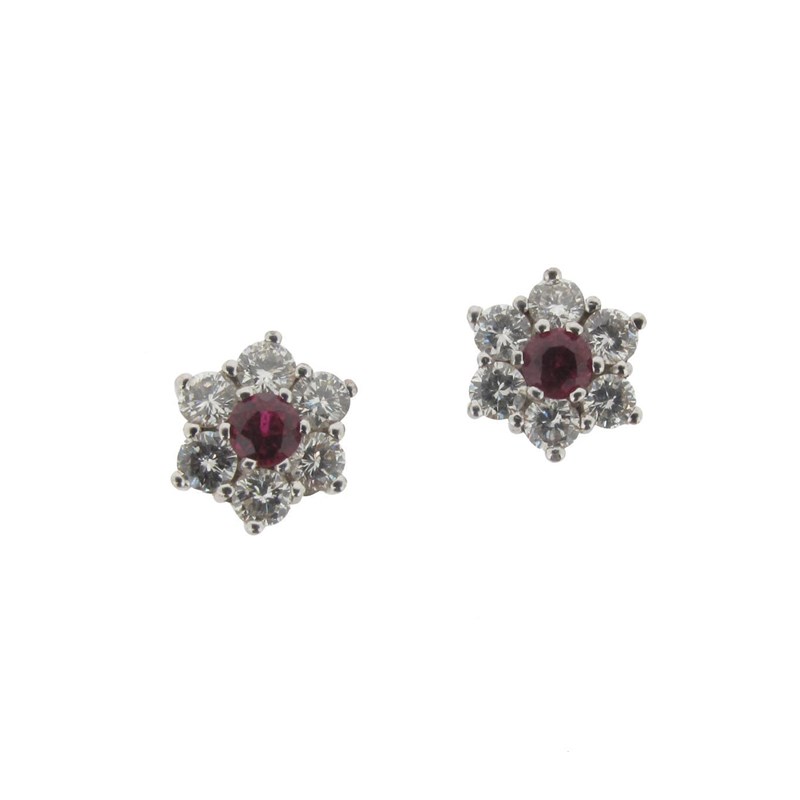 A pair of ruby and diamond cluster earrings, each stud centred with a circular cut ruby within a border of six round brilliant cut diamonds in white gold.