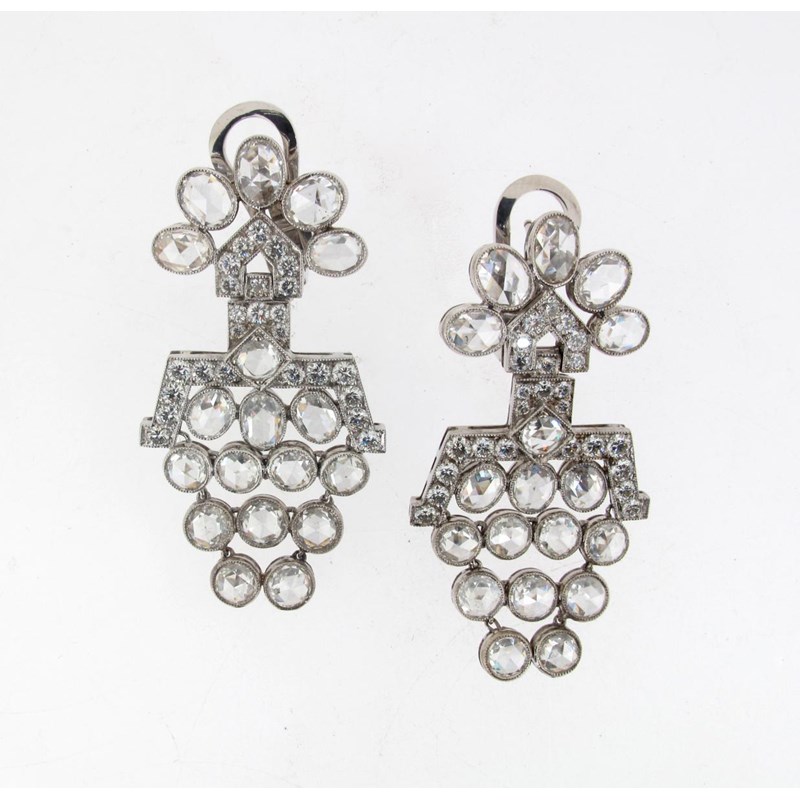 A pair of diamond drop earrings, the oval and circular rose cut diamonds suspend from the white gold body millegrain set with further smaller circular cut diamonds. 4.5cm high.