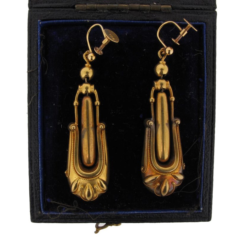 A pair of Victorian gold drop earrings, the Etruscan revival gold mounts suspending a hinged cylindrical section. Case. 5cm high.