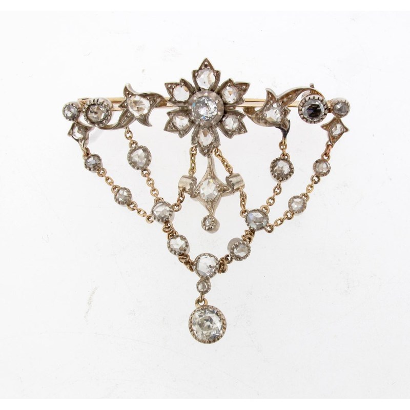 An Edwardian diamond set foliate gold bar brooch, suspending diamond festoons with fine link gold chains. 4.7cm wide.