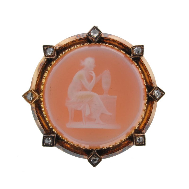 A carved hardstone cameo brooch, depicting a seated woman contemplating an urn on a pedestal. The gold circular mount set with eight rose cut diamonds. The cameo 2.5cm wide.
