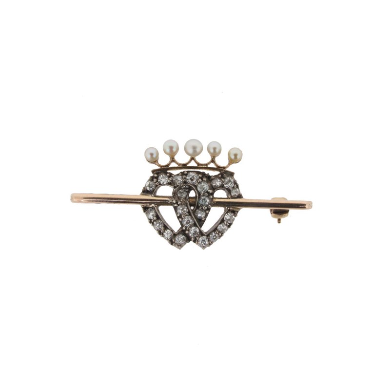 A diamond set crowned double heart bar brooch, the two hearts are surmounted with a seed pearl set stylised coronet. Cased.