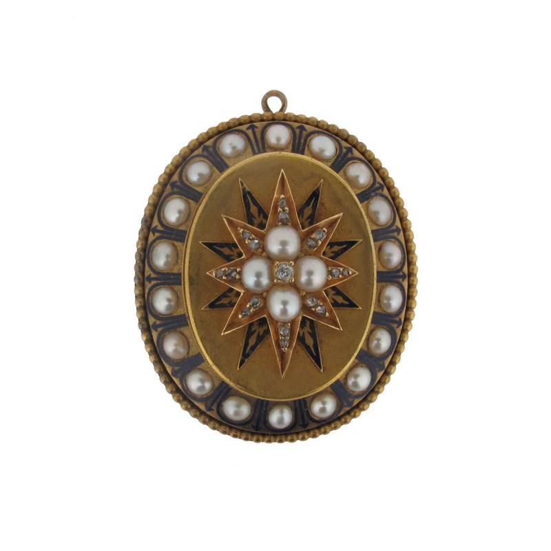 A Victorian oval gold locket brooch, centred with a star form section set with pearls and diamonds and within a half pearl border decorated with blue enamel. Glazed locket compartment to the reverse. 4.5cm wide.