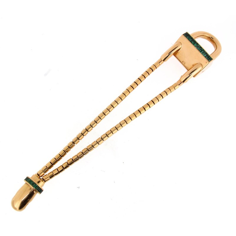 A gold Cadenas wristwatch, of typical form with articulated cylinder link strap and with calibre cut emerald decoration to the body and clasp. The plain rectangular dial with disc numerals. 18cm long.