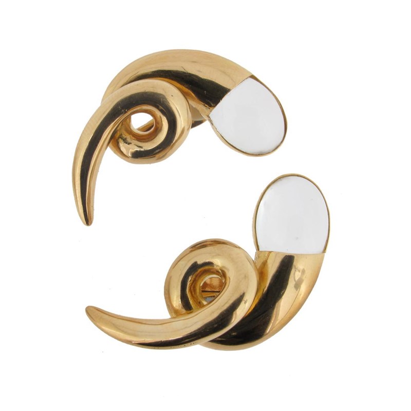 A pair of moonstone and gold scroll earrings by Lalaounis. The scrolls terminate with a cabochon...