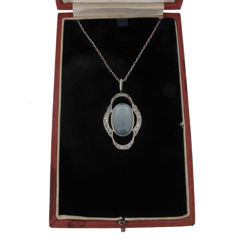 A moonstone and diamond pendant, the oval shaped moonstone is millegrain set within a border of graduated circular cut diamonds in white gold. On a fine link white gold neck chain. Fitted case.