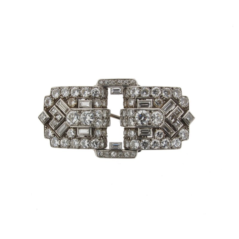 An Art Deco diamond set double clip brooch, set overall with graduated old circular cut and baguette shaped diamonds in platinum. 4.2cm wide. With additional white gold buckles to be sewn onto fabric. Cartier case.