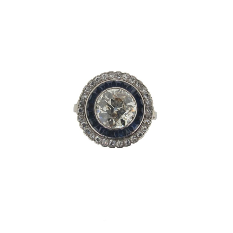 A diamond and sapphire cluster ring, the circular old cut diamond weighs approximately 2.10cts and is set within a surround of calibre cut sapphires and further border of circular cut diamonds in platinum and white gold. Size N.