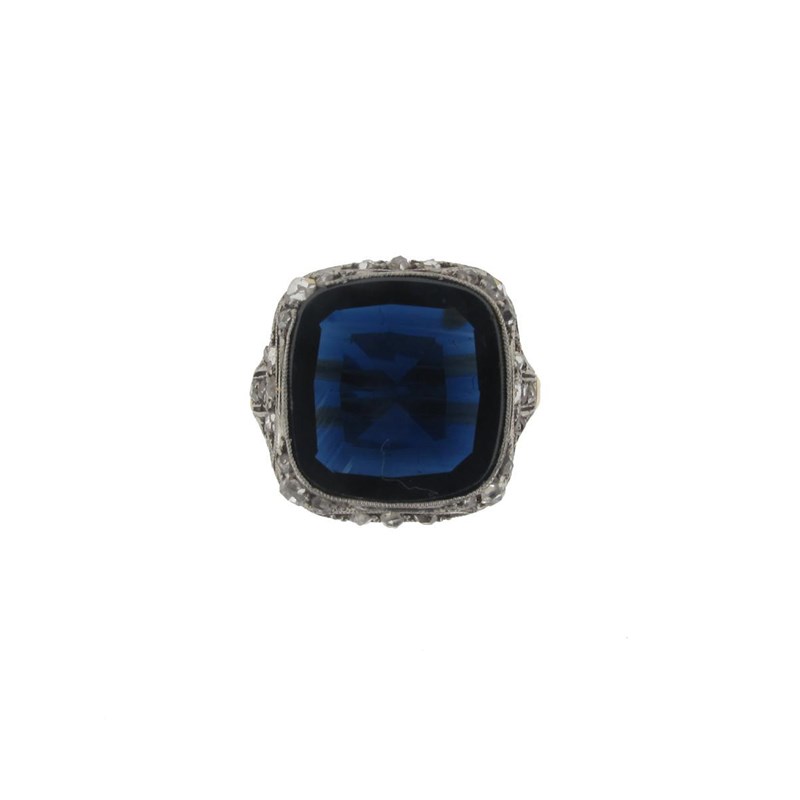 An early 20th Century flat sapphire and diamond set ring, the oval shaped flat sapphire is millegrain set in platinum with rose cut diamonds and with engraved yellow gold shank. French control marks the the exterior. Size K 1/2.