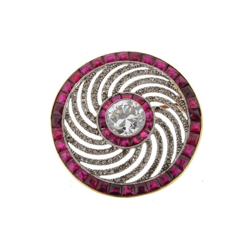 A French circular brooch, set with diamonds and rubies. The centre old circular cut diamond weighs approximately 1.30cts and is millegrain set within a surround of calibre cut rubies. Within a swirling open work section of rose cut diamonds (some missing) and a border of larger calibre cut rubies in platinum and yellow gold. French control marks. 3cm wide. Case by S.J. Phillips.